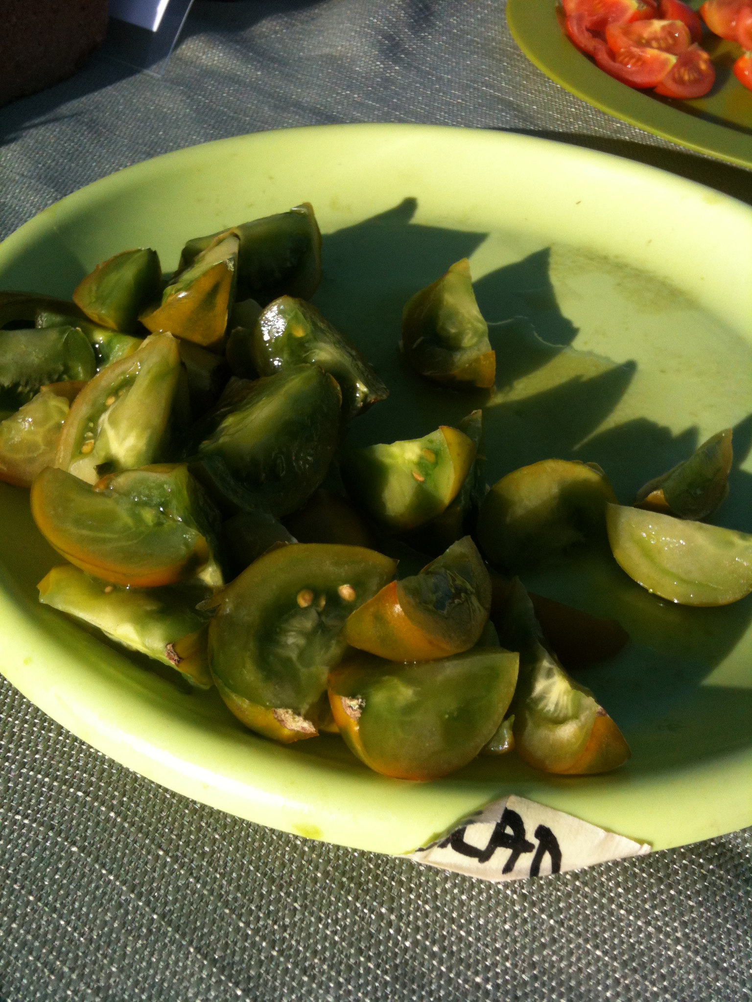 I attended the annual Heirloom Tomato Tasting at Full Circle Farm for the second time last friday. I was able to drag my friends Anna, Nancy, and Rebekah over. They quite enjoyed the variety of tomatoes. I believe there were at least 30 if not 40 kinds of tomatoes sliced up and offered for our tasting pleasure. My favorite was the Lime Green Salad tomato. There is a strong flavor of lime in it.